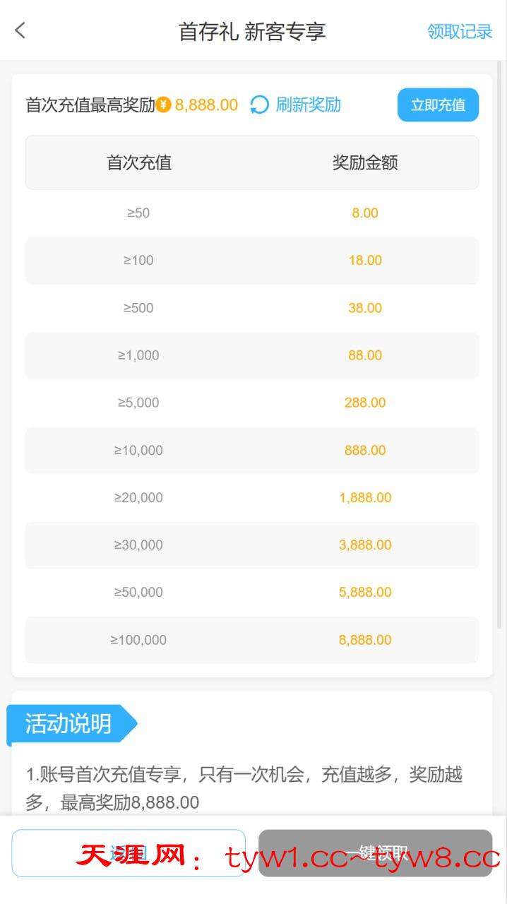 ✅ 账号首次充值专享,只有一次机会,充值越多,奖励越多,最高奖励8888元