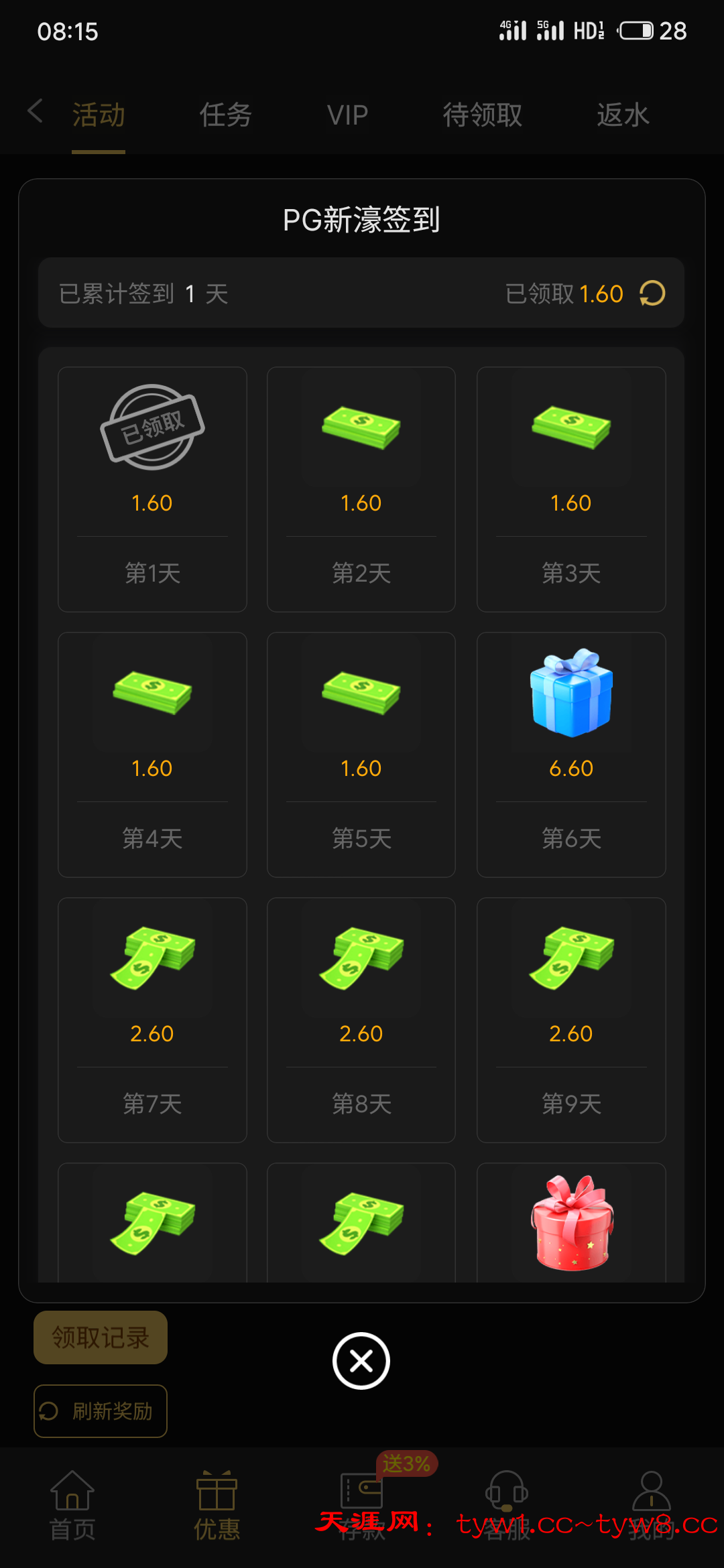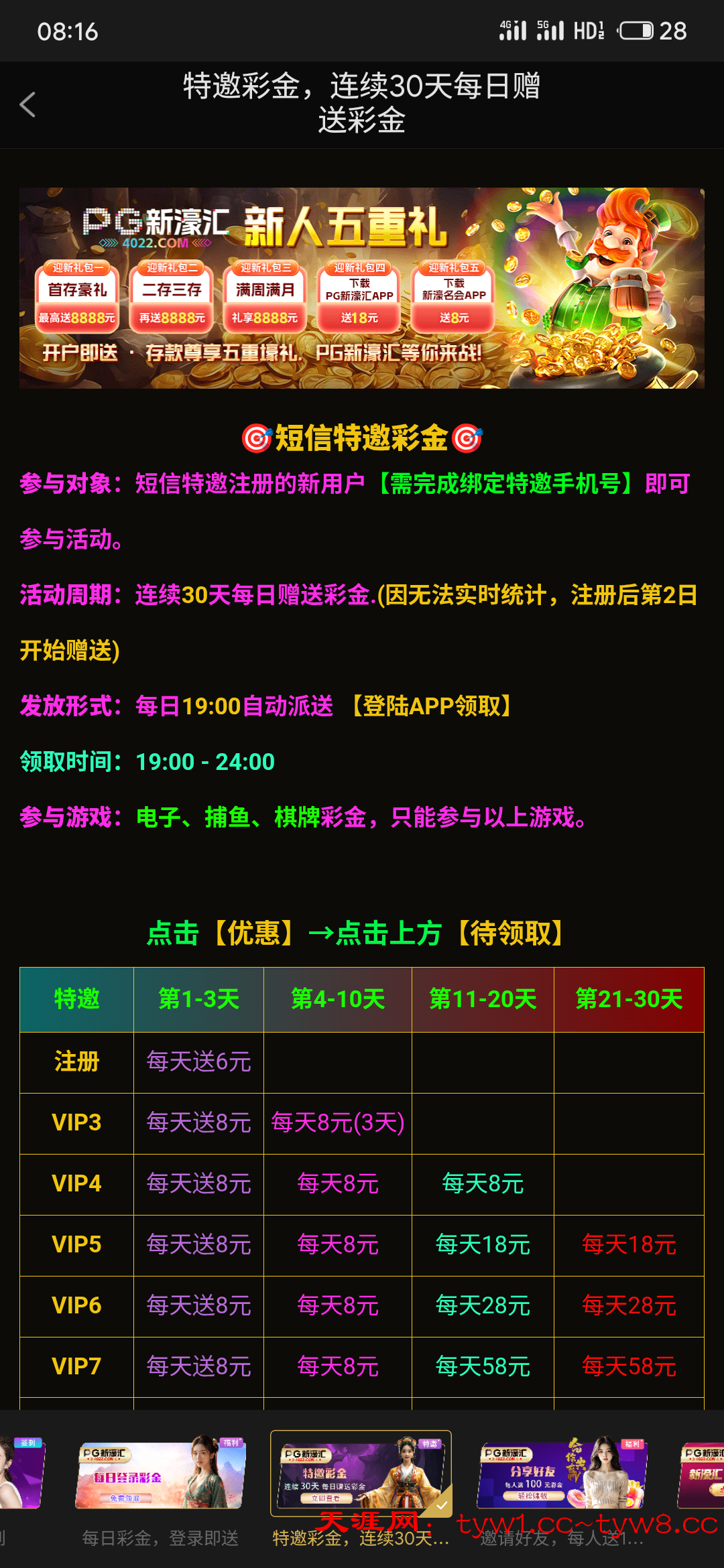 每天有签到彩金,注册验证手机号以后第二天连续三天送6彩金,限制pg