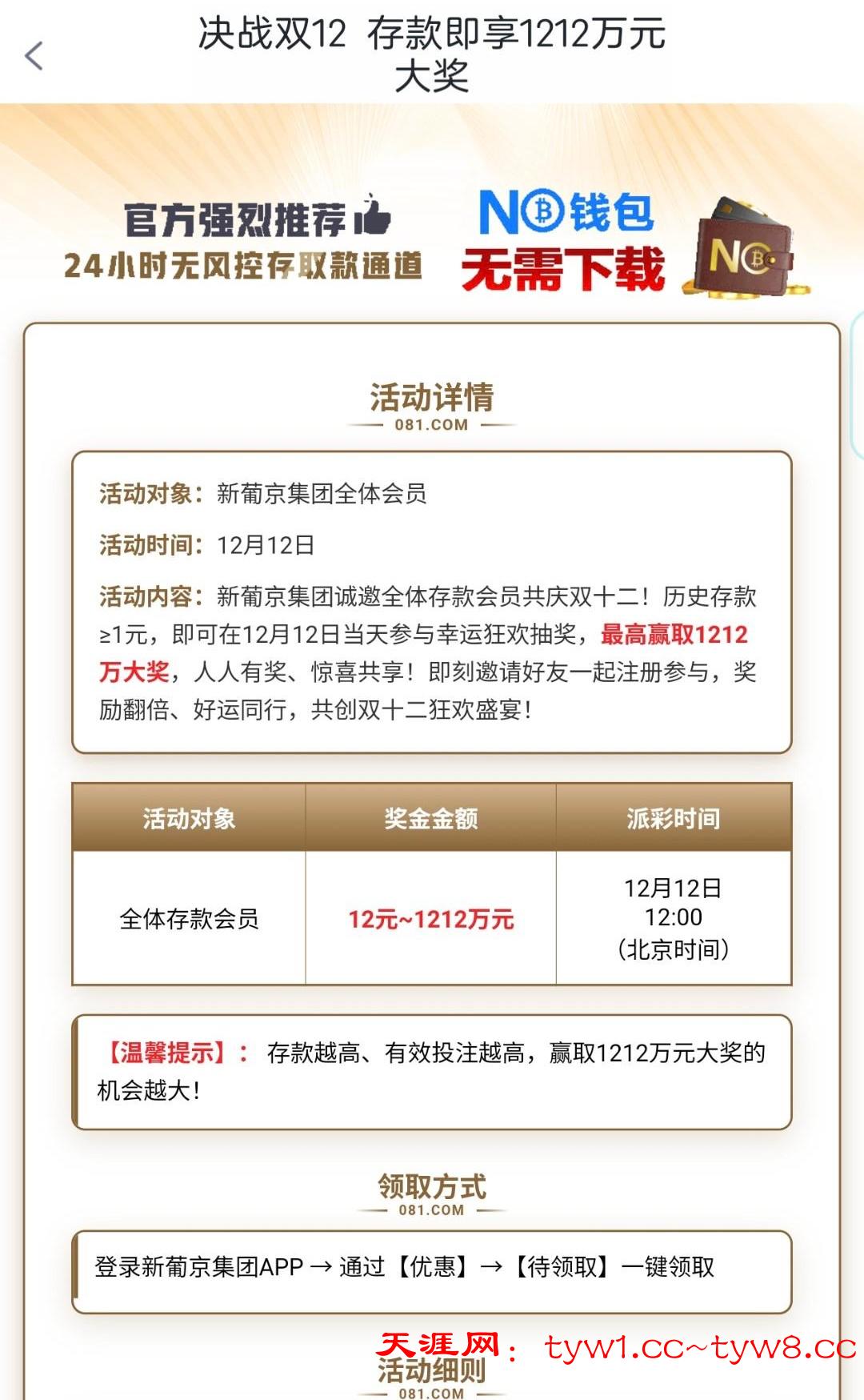 历史存款≥1元 即可在12月12日当天中午12点 有号记得上去领取